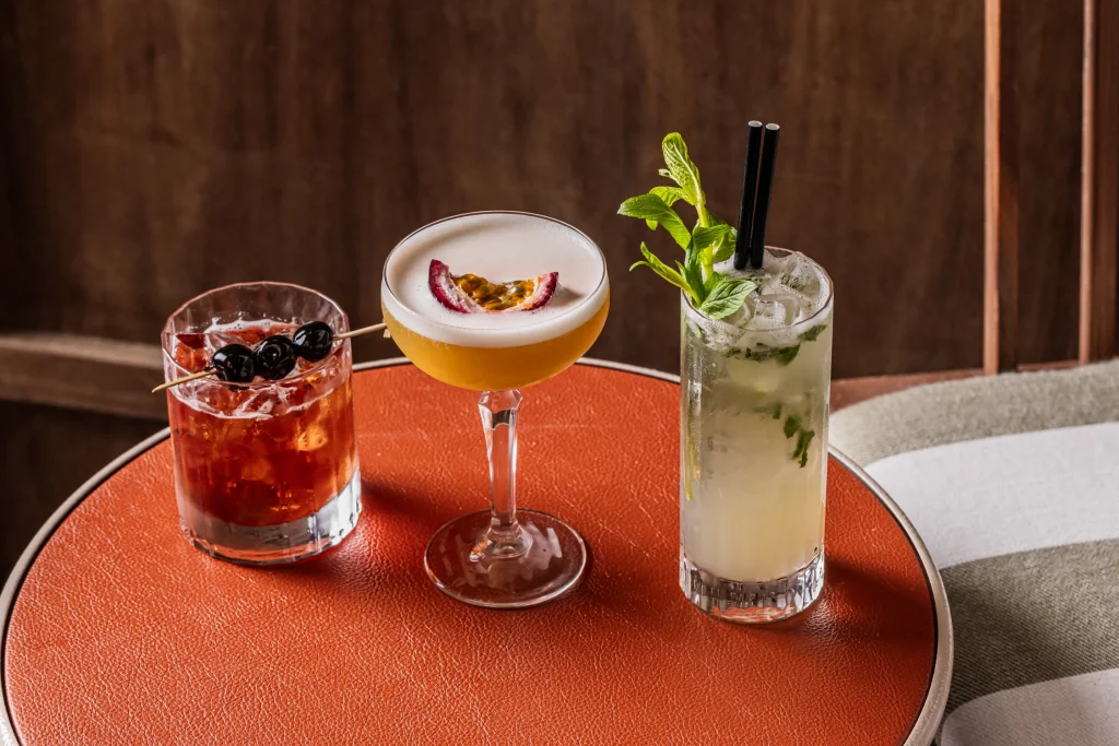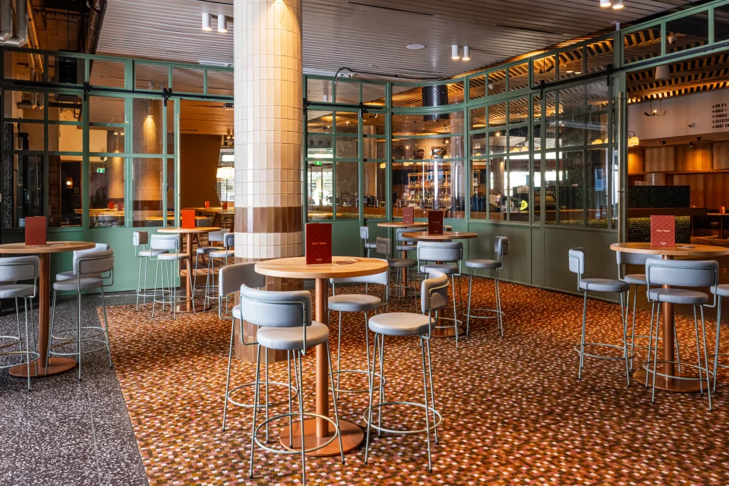 The main bar and terrace have been redesigned with a timber-and-brass back bar display, soft sandy tiles around the original columns, and new pendant lighting. The aim was to keep the heart of the hotel familiar while adding warmth and brightness.